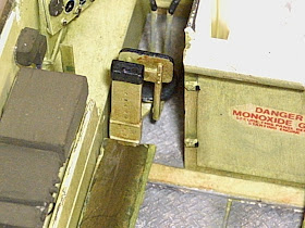 Con láminas de plasticard de 0.5 mm realicé las orejetas de fijación en altura del asiento del jefe de TOA. A estas orejetas le practique los orificios para los ejes. Los ejes los hice con alambre eléctrico forrado. El asa con alambre sin forrar. Todo lo monté en la columna del asiento del Jefe. Corté un trocito de alambre al que machaqué la punta con unos alicates y luego redondeé con una lima. Doblé el alambre en el ángulo preciso y lo pegué en un trocito de plasticard: