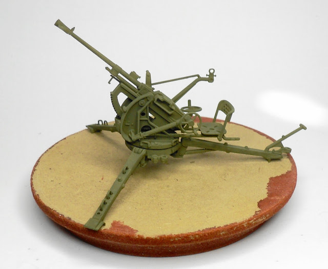 Repito que no pretendo hacer una viñeta. Simplemente colocar una figura, mas o menos adaptada al material para que se pueda apreciar el tamaño a escala de la pieza. En este caso la postura de la figura podría indicar que se ha colocado el cañón "en batería" y lo siguiente sería despejar el sector de seguridad, quitando todo lo que no sea necesario, como por ejemplo las ruedas que se han desmontado del afuste.